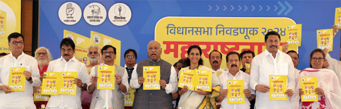 महाविकास आघाडीचा जाहीरनामा नरिमन पाईंट येथील हॉटेल ट्रायडंटमध्ये काँग्रेस अध्यक्ष मल्लिकार्जून खर्गे यांच्या प्रमुख उपस्थिती मविआतील सर्व प्रमुख नेत्यांच्या उपस्थितीत प्रकाशित करण्यात आला. यावेळी अखिल भारतीय काँग्रेस कमिटीचे सरचिटणीस के. सी. वेणुगोपाल, काँग्रेस प्रभारी रमेश चेन्नीथला, काँग्रेस प्रदेशाध्यक्ष नाना पटोले, काँग्रेस विधिमंडळ पक्षनेते बाळासाहेब थोरात, राजस्थानचे माजी मुख्यमंत्री अशोक गेहलोत, अखिल भारतीय काँग्रेस कमिटीचे सरचिटणीस अविनाश पांडे, खासदार अभिषेक मनु सिंघवी, AICC च्या मीडिया विभागाचे चेअरमन प्रविण खेरा, सचिव बी. एम. संदीप, वॉर रुम प्रभारी वामशी रेड्डी, काँग्रेस वर्किंग कमीटीचे सदस्य खा. डॉ. नासीर हुसेन, मुंबई काँग्रेसच्या अध्यक्ष खासदार वर्षा गायकवाड, राष्ट्रवादी काँग्रेस पक्षाच्या खासदार सुप्रिया सुळे, वंदना चव्हाण, शिवसेनेचे खासदार संजय राऊत, अरविंद सावंत, प्रदेश काँग्रेसचे उपाध्यक्ष संघटन व प्रशासन नाना गावंडे, प्रदेश काँग्रेसचे मुख्य प्रवक्ते अतुल लोंढे आदी उपस्थित होते.
