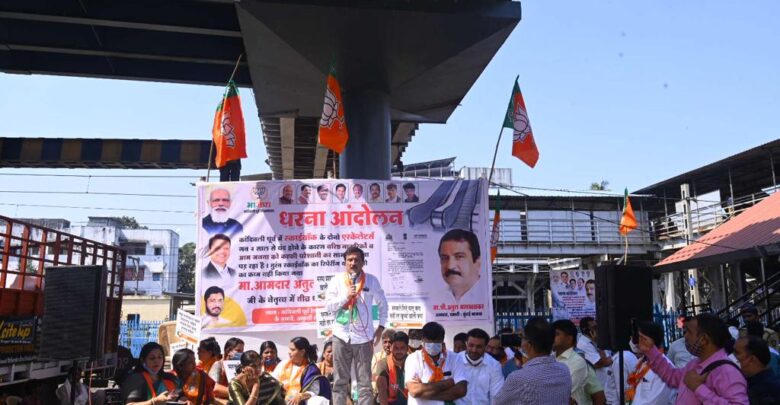 कांदिवली पूर्व रेल्वे स्थानकावरील सरकते जिने चालू करण्याकरिता आ.अतुल भातखळकर यांचे मुंबई मनपा विरोधात धरणे आंदोलन