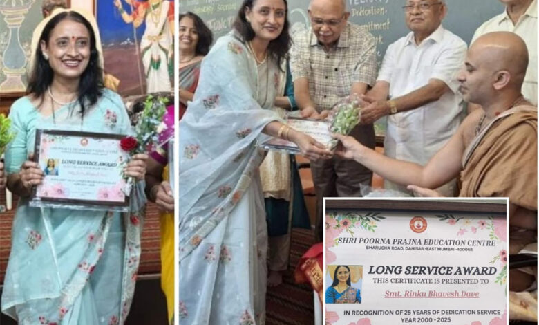 रौप्यमहोत्सवी प्रदीर्घ सेवेबद्दल सौ. रिंकू दवे सन्मानित ; दहिसरच्या पूर्णप्रज्ञा एज्युकेशन ट्रस्टने केला गौरव