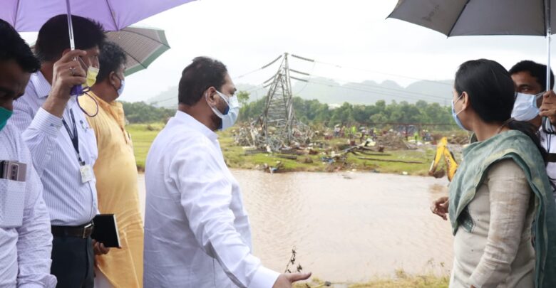 महाड येथे सावित्री नदीला आलेल्या महापुराच्या पाण्यामुळे पडलेल्या उच्चदाब वाहिनीच्या टॉवरच्या ठिकाणी ऊर्जामंत्री डॉ नितीन राऊत यांनी आज प्रत्यक्ष जाऊन पाहणी केली. महापारेषण व महावितरणच्या कर्मचाऱ्यांकडून वीज यंत्रणा उभारणीचे काम युद्धपातळीवर सुरू आहे. यावेळी डॉ राऊत यांनी पाहणी करत वीज कर्मचाऱ्यांशी संवाद साधला. पूरग्रस्त काळातील कामगिरी कौतुकास्पद असल्याची पावती त्यांनी यावेळी कर्मचाऱ्यांना दिली. महाड तालुक्यातील वीज यंत्रणेचे काम लवकरात लवकर पूर्ण करून वीज पुरवठा सुरळीत करण्याचे निर्देश त्यांनी अधिकाऱ्यांना दिले.